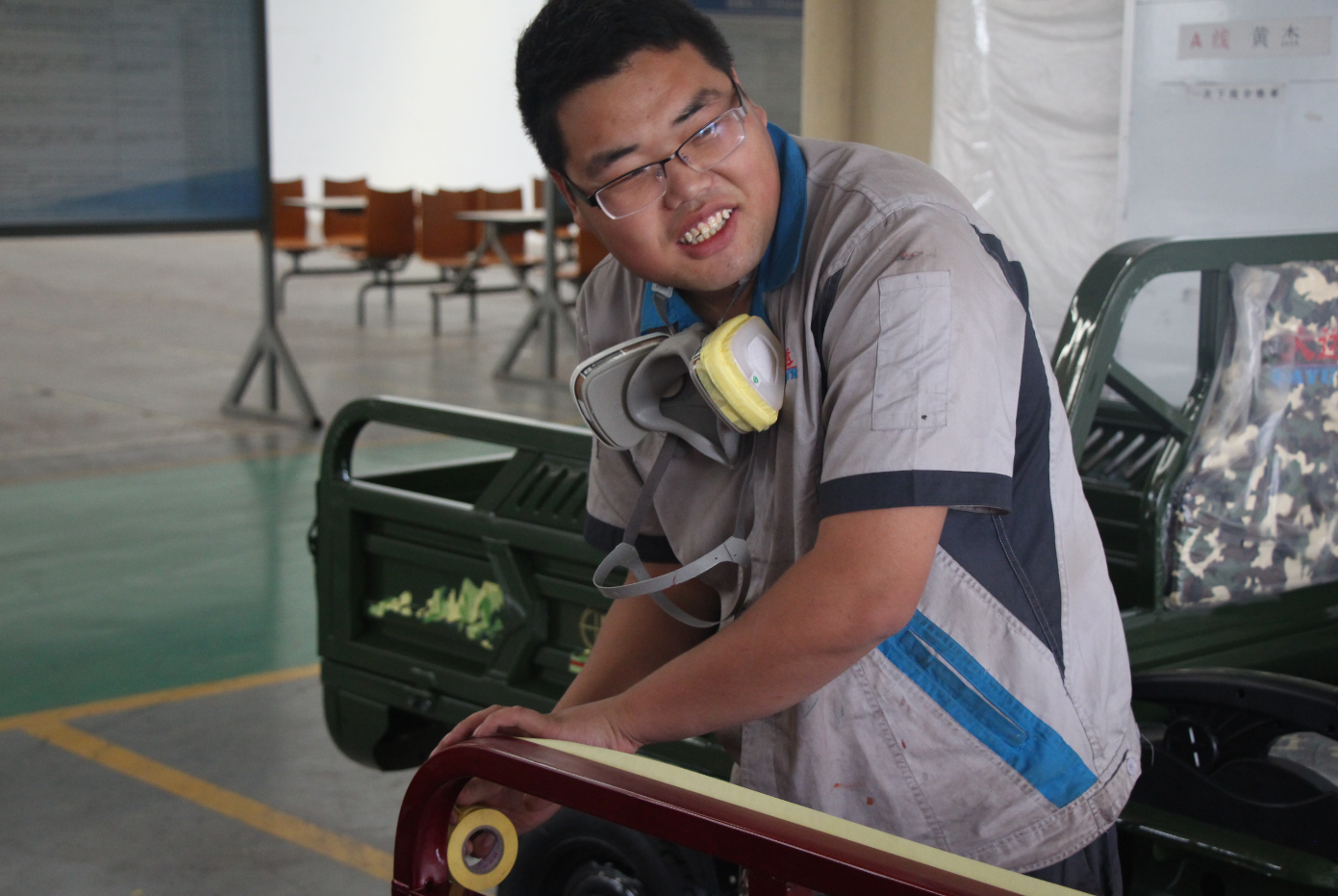 吕凯负责的工作是成车入库前的最后一道工序。车辆装配完成后会下线调试,调试完成后质保处进行检验,如果车辆没有问题,直接入库,如果有问题则要返修。但一般的返修流程都是总装处修理完毕再转入涂装,所以以吕凯为主的补漆员需要配合总装处调试区的工作时间,因为他要时刻保持通道畅通,保证车辆按时入库。